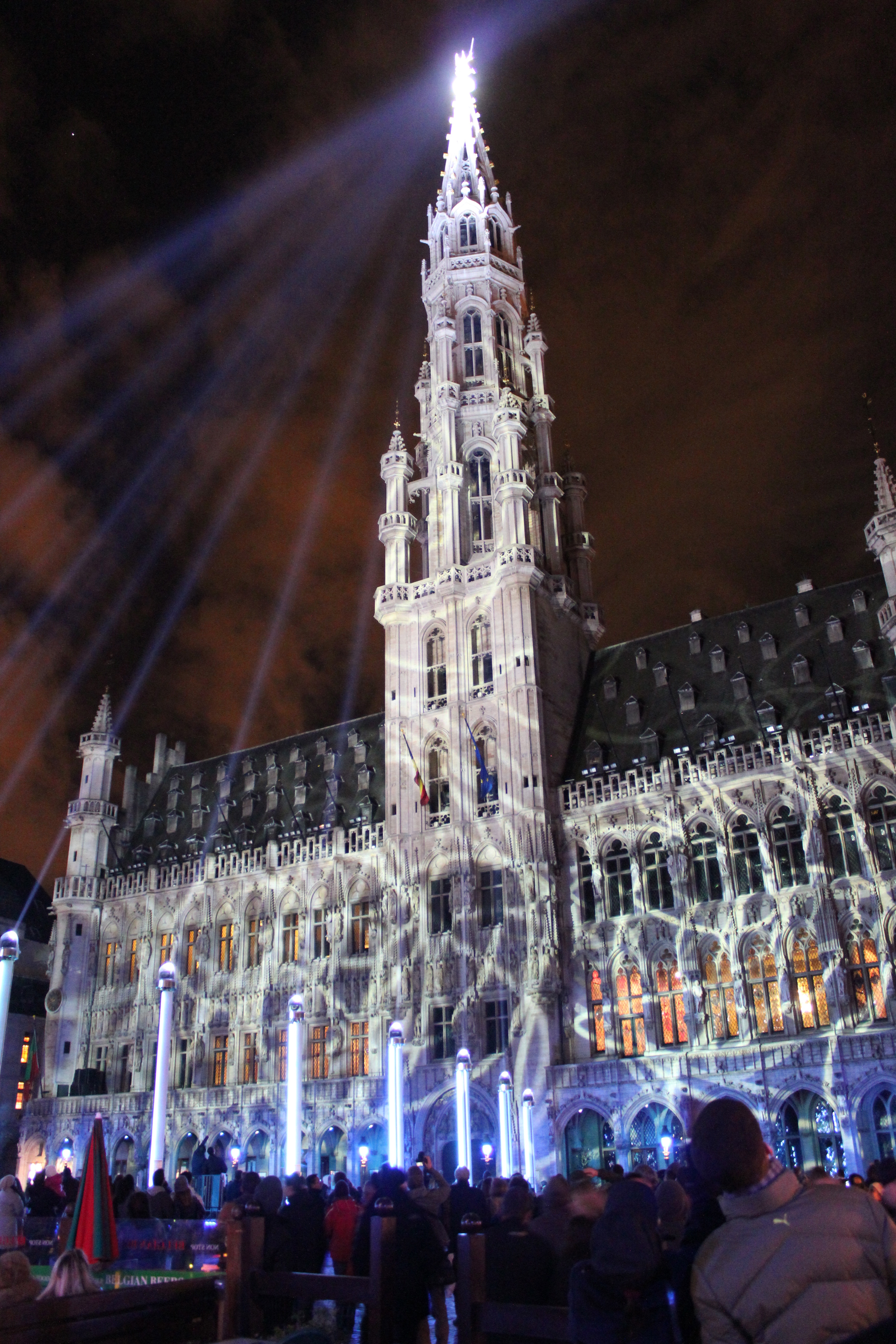 We were welcomed into Brussels by an impressive light display staged in Grand Place. Set to an array of dramatic tunes, the Electrabel Lights show treated us to a spectacular arrangement of light beamed onto the surrounding buildings. With massive passages of light shooting straight up into the black sky with a winking lone star, it was hard not to feel a little sentimental about Chrissy. Snowflakes, criss crosses, dots, lace-like patterns and flashes of rainbow colors forced us to grin and bear the pain in our necks from tilting our heads skyward. The perfect introduction to Brussels.