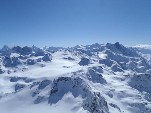 Unfortunately that unabated enthusiasm manifested itself with a ‘I’m invincible’ mentality. Oh dear. After oohing and aahhing at the sensational panoramic view from Mont Fort, one of the highest points in the region at 3300m, a little voice inside my head told me to ski down with the far more experienced group rather than take the safe option – the cable car. With moguls up to my thighs and a drop which looked every bit vertical I’m not sure why I listened to that little voice. Next time you can be sure I’ll shove a cork in it until it’s completely suffocated! The good news is I only fell once, losing my ski, ending up spread-eagled and taking a good 10mins to get on my feet again. The bad news is, I was so knackered once I got to the bottom that my legs had the shakes and I was almost ready to call it a day. It was 11am.