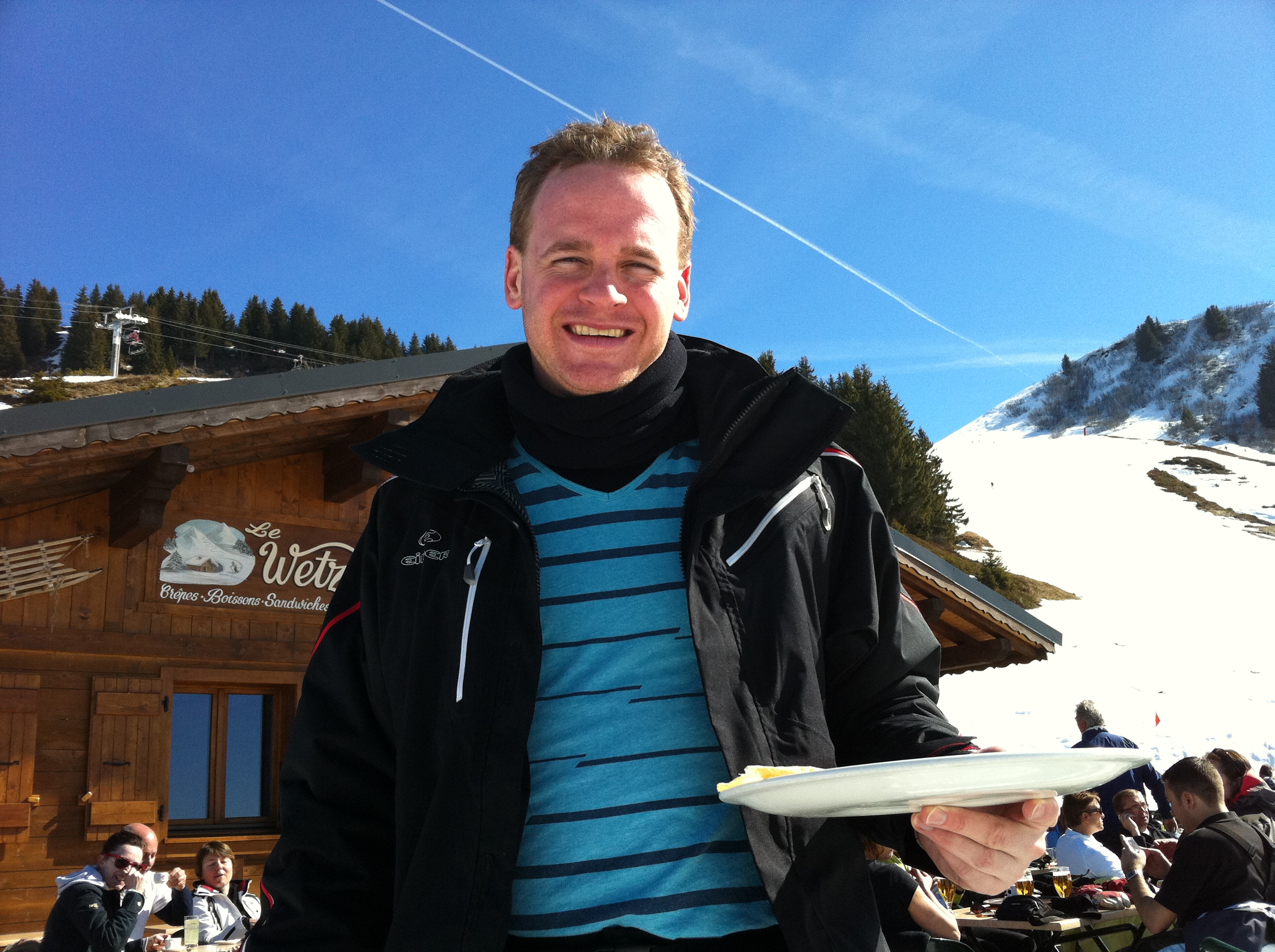 After only a few runs, Justin and I discovered our ski legs again and promoted ourselves to the red runs. Wearing our ‘red run’ upgrade like a badge of honour, we skied with confidence for several hours before stopping at a little café, half-way down one of the slopes. Having mastered a few basic phrases, Jusitn ordered deux café crème and un crepe con le beurre et sucre. After being disappointed that café crème was literally coffee with cream (not milk) we sat back in the sun and waited for the crepe to come out. The peace was broken by a high pitched scream coming from the café window. “Joostine!!! Joostine!!!   Every patron in the café turned around in unison to see who was being attacked – only to see the waitress madly gesturing from the window for Justin to come and collect his crepe. The tables of Brits around us erupted with laughter as Joostine slunk over to the café window, apologising profusely for being late. Oh how I love the language barrier when two people hear and understand completely opposite instructions. The slap on the wrist and 5 mins of mortification were well worth the delicious crepe though!