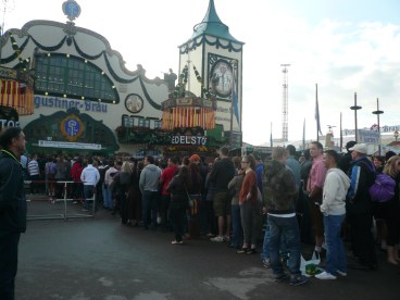 We arrived at Theresienwiese around 8.30am thinking we’d beat the majority of the crowds. We quickly discovered that 20,000 other people thought the same thing. After selecting a beer tent at random, we stood in a packed line before being hearded at a great rate of knots inside where we jumped onto a table. The beer tent we joined was called Augustiner Brau and the host informed us that around 10,000 litres were drunk in this tent everyday of the festival. We of course did our best to ensure they hit that target. The photos fairly accurately (or frighteningly) depict how our day played out but here’s a summary: